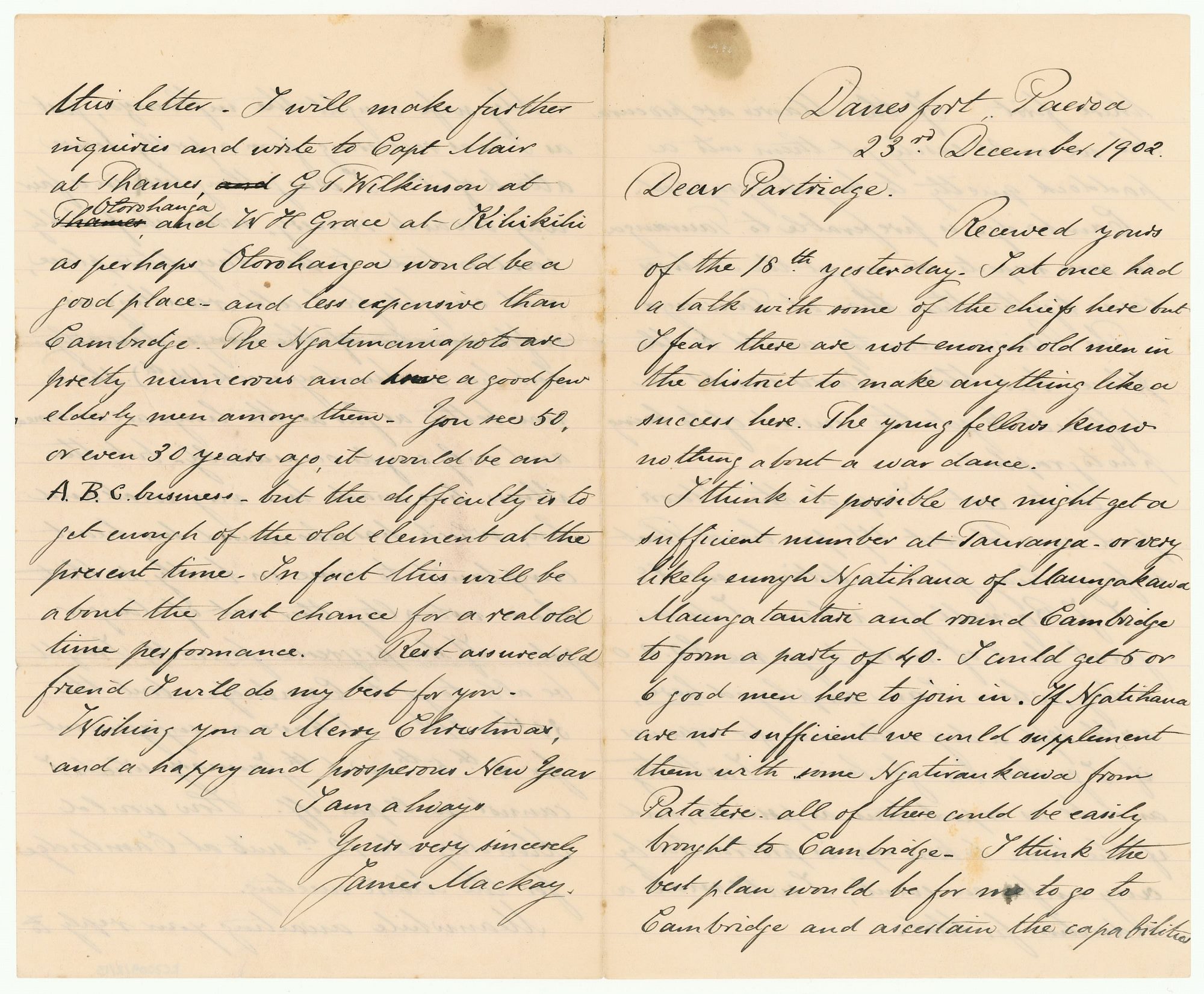 Meanwhile awaiting your reply to this letter. I will make further inquiries and write to Capt Mair at Thames, G.T. Wilkinson at Otorohanga and W.H. Grace at Kihikihi as perhaps Otorohanga would be a good place - and less expensive than Cambridge. The Ngatumaniapoto are pretty numerous and have a good few elderly men among them. You see 50, or even 30 years ago, it would be an A.B.C. business - but the difficulty is to get enough of the old element at the present time. In fact this will be about the last chance for a real old time performance. Rest assured old friend I will do my best for you.